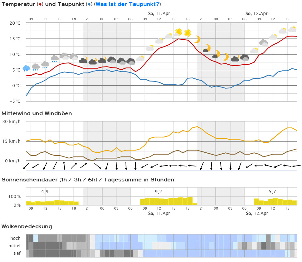 Die Temperaturen steigen auf maximal 16 Grad. Der Wind weht mäßig aus östlicher Richtung.